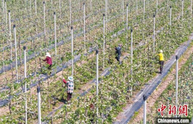 江苏宿迁:万亩苹果花盛开 蜜蜂忙授粉果农忙疏花