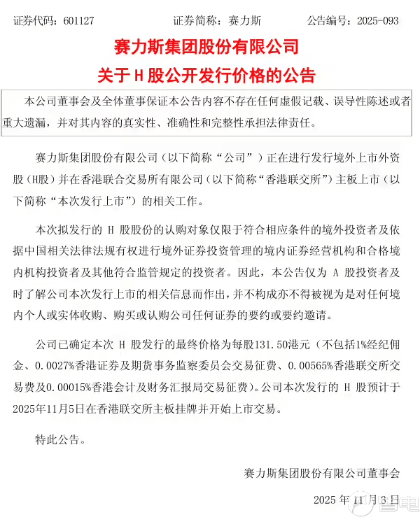 11月3日,赛力斯发布H股公开发行价格公告,确定本次H股发行的最终价格为每股131.50港元。公司本次发行的H股预计于2025年11月5日在香 港联交所主板挂牌并开始上市交易。 公开信息显示,赛力斯于今年4月提交在港上市申请,至9月获中证监批出境外上市备案通知书,拟发行不超过3.31亿股境外上市普通股。10月 13日,赛力斯集团股份有限公司通过港交所上市聆讯,并于10月27日启动国际配售和香港公开发售。 此外,赛力斯发布了10月产销快报,赛力斯新能源汽车当月销量达51,456辆,同比增长42.89%,创历史新高;今年1-10月累计销量已达356,085 辆。 根据前三季度财报,赛力斯实现营业收入1,105.34亿元,归属于上市公司股东的净利润为53.12亿元,同比增长31.56%。截至10月31日港股公开 发售结束,市场反应热烈,香港公开招股部分预计获超百倍超额认购,融资认购金额超过1,200亿港元。 ...