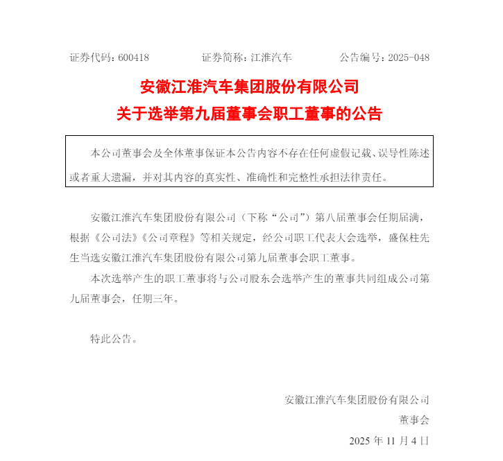 近日,安徽江淮汽车集团股份有限公司通过公告披露两项关键人事动态,分别完成第九届董事会候选人 提名及职工董事选举,为董事会换届工作奠定基础。 选举第九届董事会职工董事 11月3日晚,江淮汽车发布关于选举第九届董事会职工董事的公告,公告显示,经公司职工代表大会选 举,盛保柱先生当选安徽江淮汽车集团股份有限公司第九届董事会职工董事。本次选举产生的职工董事 将与公司股东会选举产生的董事共同组成公司第九届董事会,任期三年。 盛保柱:男,1975年6月生,中共党员,专科学历,现为安徽江淮汽车集团股份有限公司商用车制造事 业部冲焊厂钳工特级技师。先后获得国务院津贴、安徽省技能大奖、全国五一劳动奖章、江淮杰出工 匠、第五届《汽车风云盛典》风云汽车工匠、全国劳动模范等荣誉称号。 选举公司第九届董事会独立董事 10月31日,江淮汽车发布八届三十次董事会决议公告,公告显示,八届三十次董事会会议通知于2025年 10月25日送达。本次董事会会议于2025年10月30日以通讯方式召开。会议审议通过《关于选举公司第九 届董事会独立董事的议案》。 个人简历 许远怀:男,1970年11月生,中共党员,本科学历,工程师。历任安徽省电力开发总公 ...
