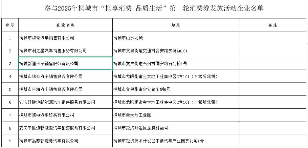 ▌来源:桐城市商务局 | 序号 | 企业名称 | 地址 | 各注 | | --- | --- | --- | --- | | I | 桐城市海青汽车销售有限公司 | 桐城市山水龙城 | | | N | 桐城市利之星汽车销售服务有限公司 | 桐城市文昌街道交通村合安路东侧4#101 | | | 3 | 桐城新迪汽车销售服务有限公司 | 桐城市文昌街道石河村同安路石河桥1号 | | | র্ব | 桐城市锦众汽车销售服务有限公司 | 桐城市龙眠街道金大地工业集中区2#101(车管所北侧) | | | 5 | 桐城市金海汽车销售服务有限公司 | 桐城市文昌街道合安路东侧6号 | | | 6 | 安庆好胜迪新能源汽车销售服务有限公司 | 桐城市龙眠街道金大地工业集中区2#101(车管所北侧) | | | 7 | 桐城市德电汽车贸易有限公司 | 桐城市金大地工业园 | | | 8 | 安庆丰胜迪新能源汽车销售服务有限公司 | 桐城市经济开发区龙腾路48号 | | | ਉ | 桐城市品荐新能源汽车有限公司 | 桐城市经济技术开发区中鼎汽车产业园东北角1号 | | 根据《2025年桐城市"桐享消费 品质生活"第一轮消费券发 ...