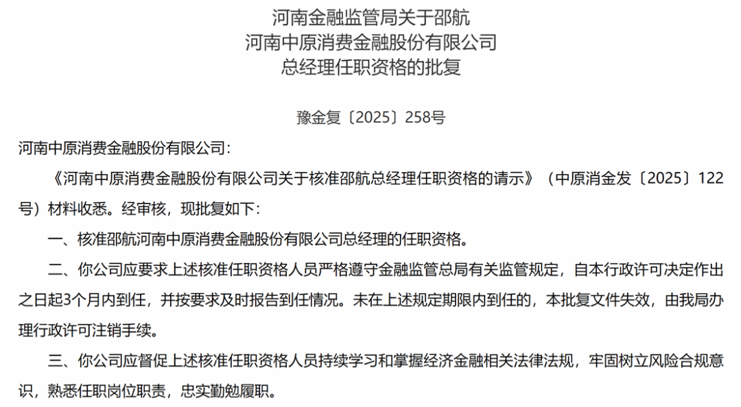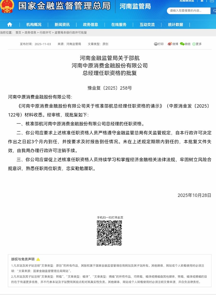 Core Viewpoint - The appointment of Shao Hang as the new general manager of Zhongyuan Consumer Finance Co., Ltd. has been approved by the Henan Regulatory Bureau of the National Financial Regulatory Administration, indicating a strategic leadership change within the company [1] Company Summary - Shao Hang has been involved in the establishment of Zhongyuan Consumer Finance and has held various positions including director and assistant general manager, demonstrating a strong internal knowledge of the company [1] - Prior to joining Zhongyuan Consumer Finance, Shao Hang worked at Haier Group, where he served as the general manager of the Consumer Finance Division and the marketing department general manager, showcasing his dual experience in both industrial and banking sectors of consumer finance [1] - His extensive background provides him with a deep understanding and unique insights into the consumer finance industry, which may benefit the company's strategic direction [1]