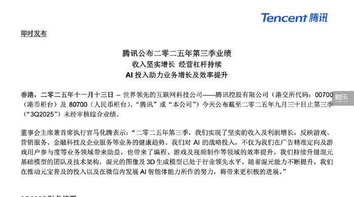 腾讯三季度业绩超出市场预期,受益于AI云服务的收入增长,腾讯。在周四晚间召开的业绩电话会 上,腾讯高层就市场最关注的问题作出回应。 对于市场最关心的资本支出问题,腾讯首席战略官詹姆斯 · 米歇尔表示,公司2025年全年实际资本支出 预计将低于之前的指引范围,但仍将高于2024年。财报显示,公司三季度资本开支129.8亿元,同比下 降24%,环比也下降逾32%。 腾讯总裁刘炽平就芯片供应问题作了解释,称公司当前的GPU储备充足,足以满足内部使用。 云业务增长的一个制约因素是AI芯片的可用性,当AI芯片实际上供应短缺时,我们会优先 满足内部使用,而不是向外租赁。换句话说,如果没有AI芯片供应限制,我们的云收入本 应增长得更快。 马化腾: 在2025年第三季度,我们实现了稳健的收入和盈利增长,这反映了游戏、营销服务以及金融 科技和企业服务各领域的健康趋势。我们在人工智能领域的战略投资正使我们受益,例如在 广告定向和游戏参与度等业务领域,以及在编码、游戏和视频制作等效率提升领域。我们正 在升级混元基础模型的团队和架构,其图像和3D生成模型现已处于行业领先地位。随着混 元能力的持续提升,我们在发展元宝应用以及努力在微信 ...