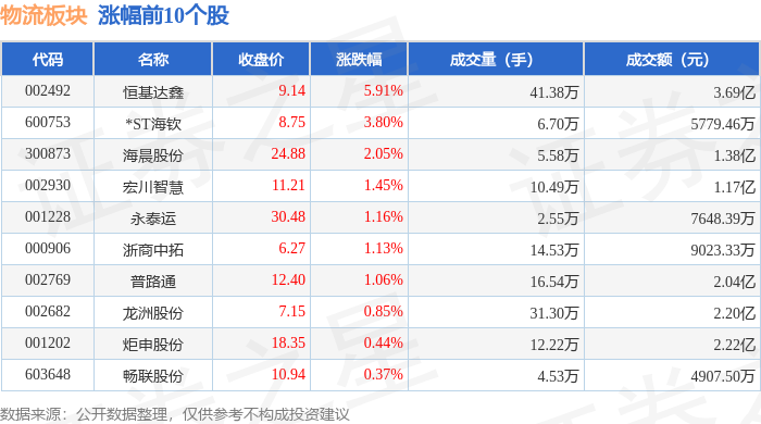| 代码 | 名称 | 收盘价 | 涨跌幅 | 成交量(手) | 成交额(元) | | --- | --- | --- | --- | --- | --- | | 002492 | 恒基达鑫 | 9.14 | 5.91% | 41.38万 | 3.69亿 | | 600753 | *ST海钦 | 8.75 | 3.80% | 6.70万 | 5779.46万 | | 300873 | 海晨股份 | 24.88 | 2.05% | 5.58万 | 1.38亿 | | 002930 | 宏川智慧 | 11.21 | 1.45% | 10.49万 | 1.17亿 | | 001228 | 永泰运 | 30.48 | 1.16% | 2.55万 | 7648.39万 | | 000906 | 浙商中拓 | 6.27 | 1.13% | 14.53万 | 9023.33万 | | 002769 | 普路通 | 12.40 | 1.06% | 16.54万 | 2.04亿 | | 002682 | 龙洲股份 | 7.15 | 0.85% | 31.30万 | 2.20亿 | | 001202 | 炬申股份 | 4 18. ...