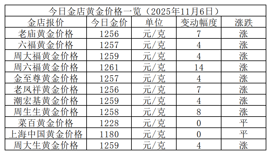 | 今日金店黄金回收价格一览(2025年11月6日) | | | | --- | --- | --- | | 回收报价 | 今日金价 | 单位 | | 黄金 | 904. 60 | 元/克 | | 菜自黄金 | 901. 50 | 元/克 | | 周生生黄金 | 896. 90 | 元/克 | | 周大福黄金 | 906. 20 | 元/克 | | 老凤祥黄金 | 915. 10 | 元/克 | 说完国内黄金价格,我们再来讲讲国际金价情况: 受美国政府继续停摆影响,市场避险情绪升温,昨日现货黄金盘中大幅反弹,最高涨至3990.10美元/盎司。不过后续又有回 落,收报3978.75美元/盎司,涨幅1.21%。今日金价继续上涨,截至发稿,现货黄金暂报3986.18美元/盎司,涨幅0.19%。 11月6日金价速报,国内品牌金店的首饰金价重新上涨,今日涨幅略低于昨日跌幅,整体价格维持在周一的水平。今日周六 福的首饰金价上涨14元/克,报1261元/克,为新的最高价金店;上海中国黄金不涨不跌,报价1180元/克,还是最低价金店。 今日金价高低价差再次扩大,报81元/克。 以下是各大品牌金店详细报价: | | | 今日金 ...