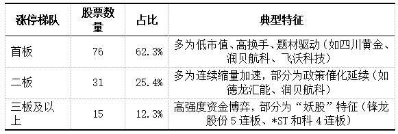 说明:电气设备(含光伏、风电、储能、充电桩)、有色金属(铜、锌、黄金、铝)、机械(专用设 备、通用设备)为三大核心主线,与政策驱动(新型工业化、设备更新)、大宗商品涨价、商业航天等 主题高度重合。 新能源汽车产业链中,锋龙股份5连板引爆汽车零部件热度,叠加一体化压铸、充电桩等细分环节持续 活跃,显示资金对新能源车后周期制造环节的持续挖掘;与此同时,钙钛矿电池与半导体材料成为科技 主线核心,沃格光电、江化微、金安国纪等标的连板,反映AI算力、消费电子复苏背景下,对国产半 导体材料与新型显示技术的强预期。 有色金属与资源品板块中,四川黄金7日4板、白银有色4连板,成为资源股中最强情绪标杆,背后是国 际金价突破历史新高、避险需求上升与国企资产价值重估的三重共振。 涨停股票覆盖23个申万一级行业,集中度较高,前五大行业合计占比超60% Wind数据显示,1月23日,A股市场共有122只股票涨停,较前一交易日保持高位活跃,显示市场风险偏 好显著回升。市场结构呈现"题材驱动+低位补涨"并行特征。 涨停潮主要由三大主线驱动,商业航天与国防军工、新能源与电力设备有色金属与资源品。 其中,商业航天成当日最强情绪引爆点,1月23 ...