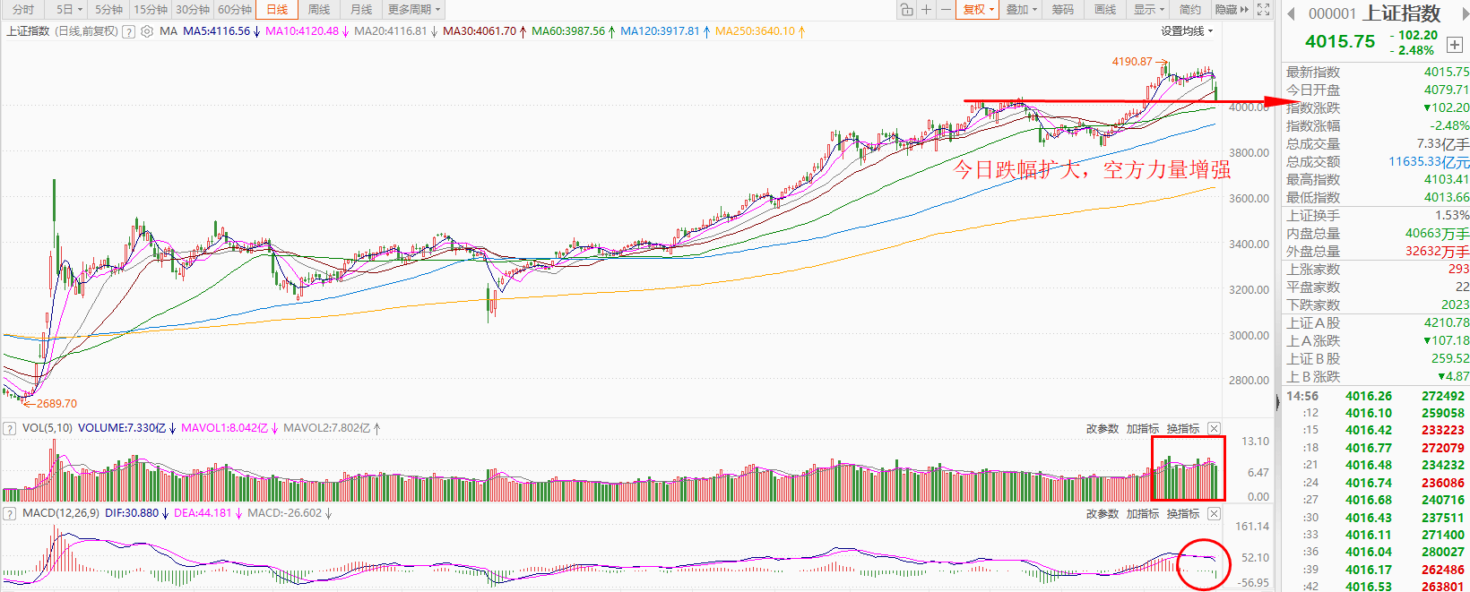 亚商投顾曾宪瑞老师提醒大家:股市有风险,投资需要多加小心,避免不必要的风险。 一、大盘 1.盘面 上证指数早盘小幅低开,随后震荡调整,午后跌幅扩大,截止收盘,指数下跌2.48%,收出大阴线,全天成交额1.16万亿,相比上交易日的1.27万亿,减少 了1100亿。 深证成指早盘小幅低开,随后震荡下跌,午后调整加速,截止收盘,指数下跌2.69%,收出大阴线,全天成交额1.42万亿,相比上交易日的1.57万亿,减少 了1500亿。 2.技术分析 图片来源:东方财富 上证指数今日低开低走,大幅下跌,个股跌停数量也是近百只,市场情绪明显转冷,恐慌盘集中释放。从技术面来看,MACD绿柱加速伸长,空方动能明显 增强;KDJ指标中三线死叉后迅速下穿50中轴,短期空头占优格局进一步确;且短期均线亦黏合死叉,多空博弈加剧,指数上行阻力明显增大。因此在量价 配合转弱、热点持续性差,市场进入典型的"空方主导+多空拉锯"阶段下,操作上更要强化纪律——不追高、不抢反弹、不满仓,宁可错过、不可做错;建 议将仓位进一步压缩,耐心等待风险充分释放后,逢低低吸或更为稳妥。 深证成指今日低开后震荡走弱,盘中一度跌破30日均线支撑,截止收盘跌幅超2 ...