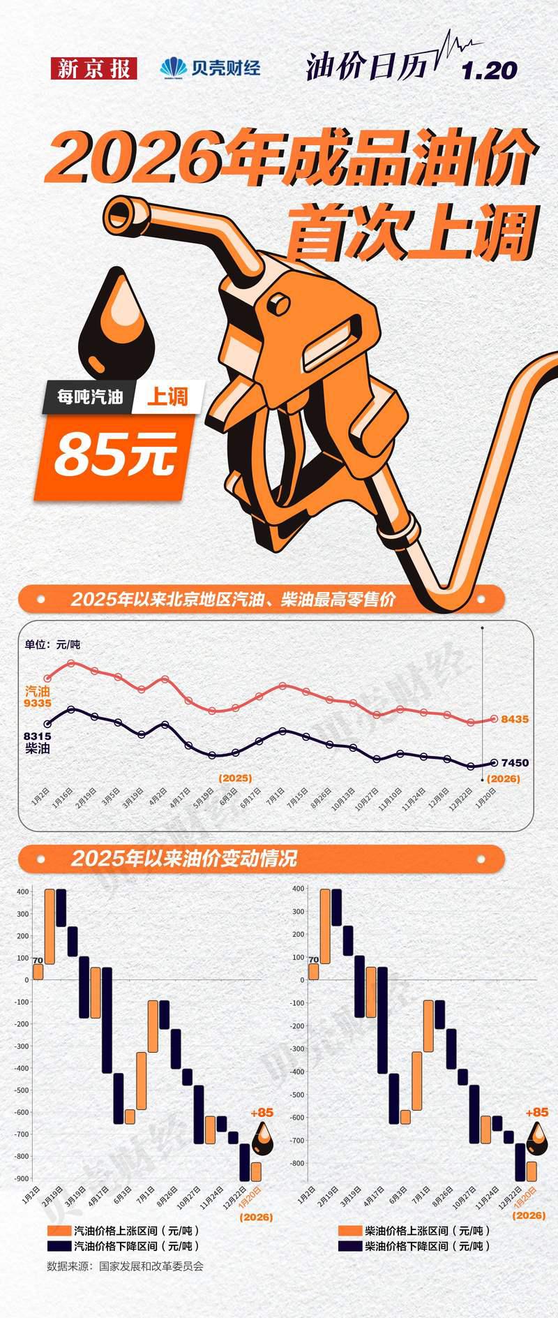 21世纪经济报道记者费心懿实习生吴慧敏 今晚24时,成品油零售限价将迎来2026年度首次上调。 1月20日,国家发改委发布消息,自24时起,国内汽油价格和柴油价格分别上调85/吨,折升价92#汽油、95#汽油、0#柴油均上调0.07元。 此次上调为2026年国内成品油零售限价首次上调,同时兑现了本周期内原油变化率由负转正、触发上调条件的市场预判。本次上调落实后,消 费者自驾出行及物流运输的用油成本将略有增加。 按当前调整幅度计算,本轮调价落实后,油箱容量在50升的小型私家车加满一箱油将比之前多花3.5元左右。以月跑两千公里,百公里油耗在8 升的小型私家车为例,到下次调价窗口(2月3日24时)开启前的半个月内,消费者用油成本将增加5元。物流行业,以月跑10000公里,百公里油 耗在38L的重型卡车为例,在下次调价窗口开启前,单辆车的燃油成本将增加124元左右。 卓创资讯(301299)成品油分析师高青翠认为,本计价周期(2026年1月6日24时至1月20日24时),中东、南美局势引发的地缘风险与供应担 忧,对油市形成利好支撑,支撑原油价格连续五日上涨,累计涨逾10%;但随着美国释放缓和信号,地缘风险迅速降温,市 ...