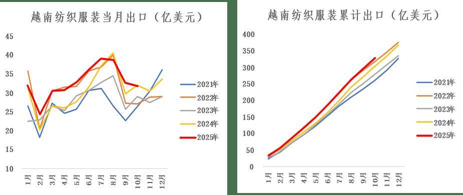 1、越南:增长迅速但供应链依赖度高 近年来,依托较低的生产成本与政策支持,东南亚与南亚地区逐步承接了部分由中国转移出的纺织产能,带动当地纺织品服装出口显著增长。其中,越 南、孟加拉、印度和巴基斯坦四国表现尤为突出,已经在全球纺织服装出口格局中占据重要地位,而中国正从"成品出口国"转型为"中间品供应国",2025 年1–9月对东盟与南亚三国纱线出口合计增长超20%,成为四国出口的"隐形引擎"。本文将从上述四国的纺织服装贸易视角出发,分析其今年的出口现 状、产业优势与劣势,来评估当前纺织品国家的出口格局以及国际竞争力。 越南纺织服装出口 来源:越南海关 近年来,越南纺织服装出口规模呈现持续扩张态势。从越南海关数据来看,2016-2021年间越南纺服年出口额都维持在350亿美元以下,而自2022年开始实 现显著突破,连续三年保持在350亿美元上方,其中2022年更是依靠低廉的劳动力和原材料创下378亿美元的历史新高。 根据最新越南海关数据,2025年1-10月越南纺服出口累计值为329亿美元,同比增加8.4%,已经超过了2021年的全年出口量,力争实现2025年480亿美元的 出口目标。今年如此优越的贸易量主要得益 ...