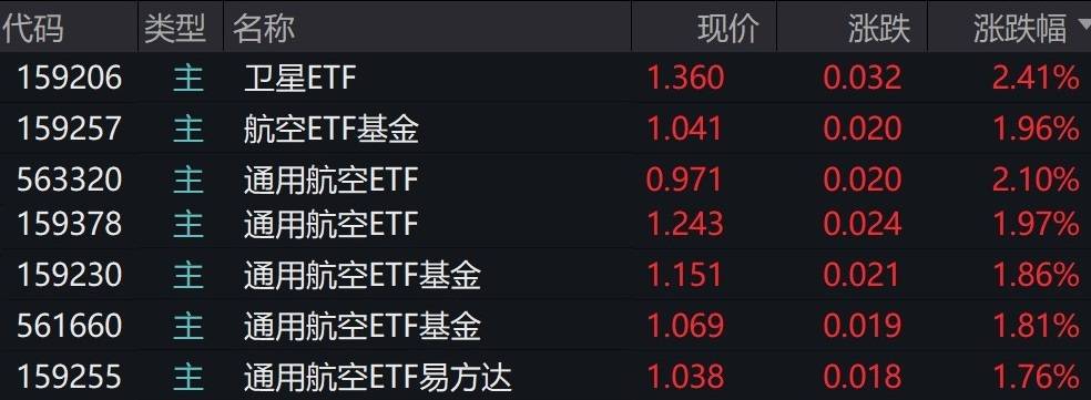 卫星、航空概念股走强,隆盛科技涨超5%,航天电子涨超4%,应流股份涨超3%。 受盘面影响,卫星、通用航空相关ETF涨约2%。 每日经济新闻 | 代码 | 类型 | 名称 | 现价 | 涨跌 | 涨跌幅 | | --- | --- | --- | --- | --- | --- | | 159206 | 主 | 卫星ETF | 1.360 | 0.032 | 2.41% | | 159257 | 主 | 航空ETF基金 | 1.041 | 0.020 | 1.96% | | 563320 | 主 | 通用航空ETF | 0.971 | 0.020 | 2.10% | | 159378 | 主 | 通用航空ETF | 1.243 | 0.024 | 1.97% | | 159230 | 主 | 通用航空ETF基金 | 1.151 | 0.021 | 1.86% | | 561660 | 主 | 通用航空ETF基金 | 1.069 | 0.019 | 1.81% | | 159255 | 主 | 通用航空ETF易方达 | 1.038 | 0.018 | 1.76% | 有机构分析称,近年来,我国商业航天在政策牵引、 ...