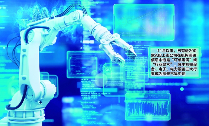 郭晨凯 制图 ◎记者 高志刚 郭成林 订单是企业最真实的经营语言,订单数据则是产业景气度的"晴雨表"。2025年岁末,随着上市公司密集 披露机构调研信息,一组积极的经营信号跃然纸上。 据上海证券报记者梳理,11月以来,已有近200家A股上市公司明确表示"订单饱满"或"行业景气",其中 机械设备、电子、电力设备三大行业成为高景气集中地。 科达制造表示,今年前三季度陶瓷机械业务接单金额已超去年同期,其中海外订单占比超65%。公司明 确将持续推进全球化布局,通过进一步提升海外订单比重,以平滑行业周期波动。 值得关注的是,当前中国企业的出海逻辑已全面升级。 柳工在2025年"11·26全球客户节"上收获大量高端市场意向订单,尤其是来自电动智能设备、矿山设 备、全面解决方案及行业大客户。这是价值链协同的生动体现。 新兴产业订单持续高增长 "这些数据折射出中国部分产业竞争力快速提升。如全球化突破提速,机械设备、通信设备等领域公司 获得欧美高端市场订单,出海逻辑已从成本优势转向技术品牌优势;又如科技趋势加速兑现,AI算力 需求爆发、储能市场快速复苏、半导体行业呈现周期复苏与国产替代深化的双重利好。"淡水泉一位基 金经理对上 ...