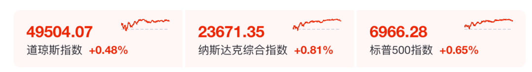 【宏观消息】 周五,三大指数收高,标普500指数再创历史新高。美国12月非农就业人数增加5万低于预期,失业率降 至4.4%低于预期。美国最高法院完成周五披露意见的工作,但并没有公布对特朗普关税的判决结果。 美国最高法院表示,下周三1月14日将是其下一次公布裁决的日子。 美股三大指数本周均录得涨幅,标普500指数本周上涨1.57%,而道指和纳指分别上涨2.32%和1.88%。 【美股】截至收盘,道指涨237.96点,涨幅为0.48%,报49504.07点;纳指涨191.33点,涨幅为0.81%, 报23671.35点;标普500指数涨44.82点,涨幅为0.65%,报6966.28点。周五标普500指数最高上涨至 6978.36点,创盘中历史新高。芯片股普涨,甲骨文(ORCL.US)涨4.95%,博通(AVGO.US)涨3.76%,英 特尔(INTC.US)涨10.8%。 【欧股】德国DAX30指数涨138.30点,涨幅0.55%,报25264.21点;英国富时100指数涨81.71点,涨幅 0.81%,报10126.40点;法国CAC40指数涨118.62点,涨幅1.44%,报8362.09点;欧洲斯托克50 ...