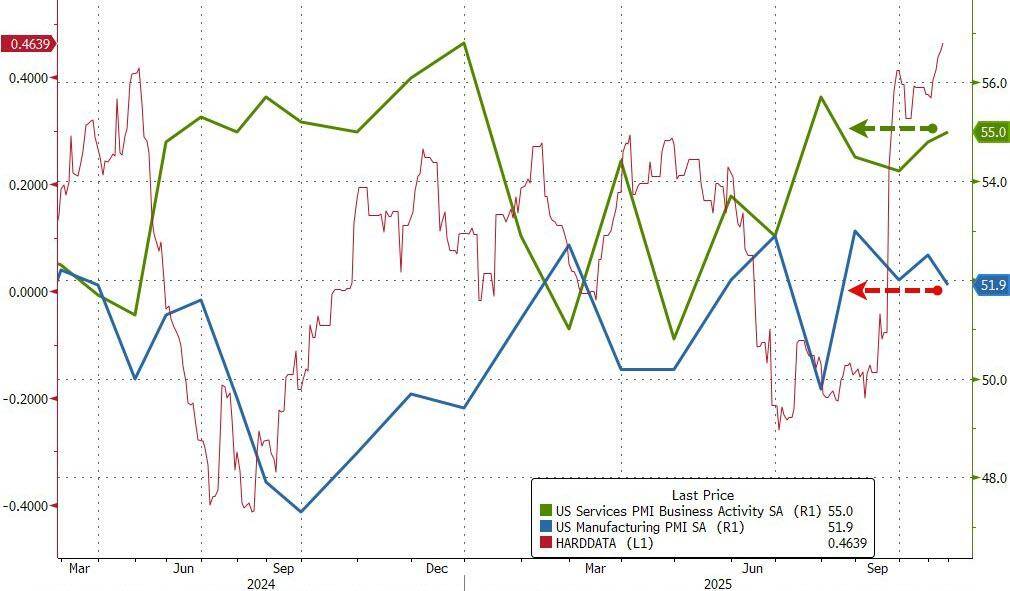 Core Insights - The US business activity expanded at the fastest pace in four months in November, with a notable improvement in optimism regarding the economic outlook, although manufacturing growth slowed [1][6]. Summary by Categories Manufacturing Sector - The US November Markit Manufacturing PMI was 51.9, below expectations of 52 and down from 52.5 in October [7]. - There was a decrease in new orders and a record increase in finished goods inventory, raising concerns about potential future production slowdowns if demand does not rebound [11]. Services Sector - The US November Markit Services PMI was 55, exceeding expectations of 54.6 and up from 54.8 in October [7]. - The composite new orders index reached its highest level of the year, driven by a rebound in service sector activity [3]. Composite Indicators - The US November Composite PMI was 54.8, marking the second consecutive month of increase, surpassing expectations of 54.6 [7]. - Future output expectations jumped by 7.3 points, the largest single-month increase in five years, indicating heightened business confidence [4][9]. Inflation and Costs - Inflationary pressures accelerated for the first time since July, with the composite materials prices index rising to 63.1, the second highest in three years [4]. - Input cost indices for services reached their highest levels since early 2023, and service firms reported increased pricing indicators [4]. Employment Trends - Employment growth showed a slight slowdown, influenced by cost concerns related to tariffs, despite overall job increases in November [11]. - Companies reported a reduction in the procurement of inputs for the first time since April, indicating cautious spending in the manufacturing sector [5]. Economic Outlook - The annualized GDP growth for the fourth quarter is estimated to be around 2.5%, reflecting a relatively strong economic performance [6]. - Expectations for further interest rate cuts and the resolution of government shutdowns have contributed to improved optimism and a broader economic recovery trend [10].