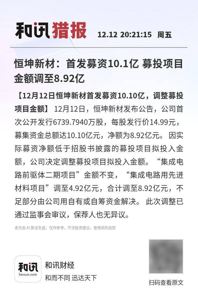 【12月12日恒坤新材首发募资10.10亿,调整募投项目金额】12月12日,恒坤新材发布公告,公司首次 公开发行6739.7940万股,每股发行价14.99元,募集资金总额达10.10亿元,净额为8.92亿元。因实际募 资净额低于招股书披露的募投项目拟投入金额,公司决定调整募投项目拟投入金额。"集成电路前驱体 二期项目"金额不变,"集成电路用先进材料项目"调至4.92亿元,合计调至8.92亿元,不足部分由公司用 自有或自筹资金解决。此次调整已通过监事会审议,保荐人也无异议。 和讯财经 和而不同 迅达天下 扫码查看原文 本文由 AI算法生成,仅作参考,不涉投资建议,使用风险自担 和讯猎报 12.12 20:21:15 周五 恒坤新材:首发募资10.1亿 募投项目 金额调至8.92亿 【12月12日恒坤新材首发募资10.10亿,调整募投 项目金额】 12月12日,恒坤新材发布公告,公司首 次公开发行6739.7940万股,每股发行价14.99元, 募集资金总额达10.10亿元,净额为8.92亿元。因实 际募资净额低于招股书披露的募投项目拟投入金 额,公司决定调整募投项目拟投入金额。"集成电 路前驱体二期项目"金额 ...