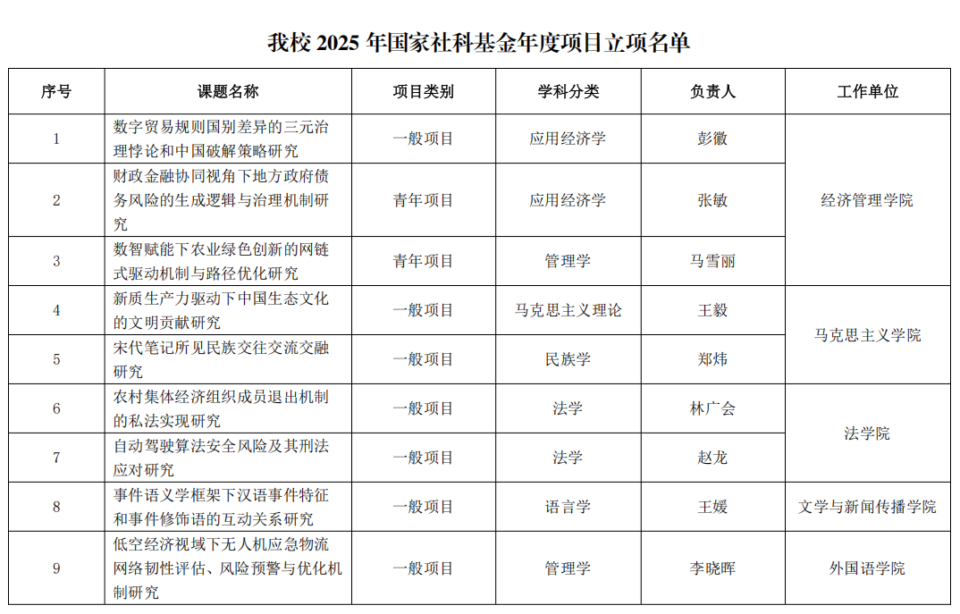 国家社会科学基金项目是我国哲学社会科学领域最高级别的科研项目,是衡量高校及科研机构学术研究实力与水平的核心标志。烟大高度重视国家社科 基金项目的申报组织工作。社会科学处与各文科学院紧密协同,遵循学校第五次党代会确立的新发展目标和"一五八一"总体部署,以改革提质为核心, 各尽其责、强化协作。通过提前谋划、系统布局,持续强化有组织科研,完善全链条工作机制,构建起学校、学院和科研教师三方联动的纵向项目申报 体系。通过系统化、专业化的辅导与服务,有效激发了教师的申报热情,显著提高了项目申报书质量。社会科学处将进一步创新机制、优化服务、提质 增效,做实做细全过程管理与服务,推动学校哲学社会科学繁荣发展,为服务国家战略需求贡献更大力量。 近日,全国哲学社会科学工作办公室公布了2025年国家社会科学基金年度项目立项名单。烟台大学获批9项(一般项目7项、青年项目2项),立项数位列全 省高校第8位,省属高校第7位。据统计,2025年全国共有601所高校获批国家社科基金年度项目,烟大立项数列第171位,立项数及位次均创历史新高。 | 序号 | 课题名称 | 项目类别 | 学科分类 | 负责人 | 工作单位 | | --- | - ...