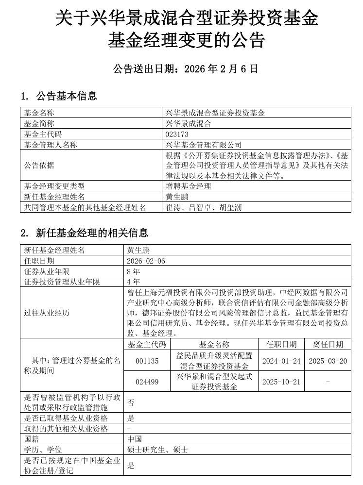 深圳商报·读创客户端记者 詹钰叶 兴华基金旗下一只产品日前宣布增聘基金经理,并与原有的3名基金经理共管;而这只产品去年末规模不 足8000万元,年内业绩不佳。这一罕见操作引起市场热议。 | 基金名称 | 兴华景成混合型证券投资基金 | | --- | --- | | 基金简称 | 兴华景成混合 | | 基金主代码 | 023173 | | 基金管理人名称 | 兴华基金管理有限公司 | | 公告依据 | 根据《公开募集证券投资基金信息披露管理办法》、《基 金管理公司投资管理人员管理指导意见》及其他有关法 | | | 律法规以及本基金相关法律文件等。 | | 基金经理变更类型 | 增聘基金经理 | | 新任基金经理姓名 | 黄生鹏 | | 共同管理本基金的其他基金经理姓名 | 崔涛、吕智卓、胡玺潮 | 具体来看,吕智卓的累计任职时间超过5年,现任基金资产管理总规模为35.84亿元,在管基金最佳任期回 报为17.78%。但其现任兴华基金固收公募部副总经理,历任产品多为债券型基金,市场担忧其对权益类产 品的管理经验不足。崔涛的基金经理累计任职时间接近3年,现任基金资产管理总规模为1.5亿元,在管基 金最佳任期回报为4 ...