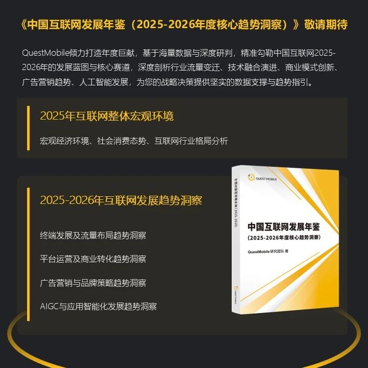 Group 1 - The article presents an overview of the upcoming "China Internet Development Yearbook (2025-2026)" which aims to provide insights into the development blueprint and core tracks of the Chinese internet industry [1] - It emphasizes the importance of analyzing industry flow changes, technological integration, business model innovation, advertising marketing trends, and the development of artificial intelligence to support strategic decision-making [1][3] - The yearbook is based on extensive data and in-depth research, highlighting the macroeconomic environment, social consumption trends, and the overall landscape of the internet industry in 2025 [2][3] Group 2 - The report will cover various trends including terminal development and traffic layout, platform operation and commercial conversion, advertising marketing and brand strategy, as well as AIGC and application intelligence development [3] - It aims to capture trend pulses and anchor strategic directions while building industry focus and amplifying brand potential [3]
