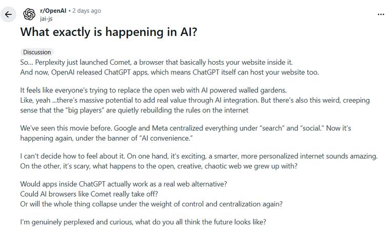 Core Insights - The recent launch of Perplexity's Comet browser and OpenAI's ChatGPT app has sparked a debate on whether AI is undermining the open internet [1][3] - Users express concerns that AI is creating "walled gardens," reminiscent of past monopolies by Google and Meta, indicating a potential shift in internet dynamics [1][3] Group 1: New Power Dynamics - The Comet browser and ChatGPT Apps are seen as attempts to reclaim power over web distribution, positioning AI as a gatekeeper of information [3] - This shift represents a transition from static web pages to AI-driven content distribution, marking the third major transformation in internet history [3] Group 2: Nostalgia for the Early Internet - Users reminisce about the early 2000s internet, which was characterized by creativity and diversity, contrasting it with today's controlled environment [4] - There is a deep concern over the loss of freedom and variety in information access, as users increasingly rely on algorithms from a few dominant platforms [4] Group 3: The Impact of AI Browsers - The rise of AI browsers may exacerbate the trend of users receiving filtered information rather than engaging with original content [5] - Concerns are raised about the potential loss of independent thought and choice as content becomes overly customized to individual preferences [5] Group 4: Diverging Perspectives - Some users argue that AI could democratize technology, allowing smaller companies to offer complex services previously dominated by larger firms [6] - Others believe that the anxiety over AI's impact on the internet is not new, suggesting that each generation of internet users faces similar concerns [6] Group 5: The Choice Between Convenience and Autonomy - The discussion highlights a fundamental question: whether to prioritize convenience offered by AI tools or to maintain control over information access [7] - Users are encouraged to actively seek diverse information sources and remain vigilant about the implications of AI on their autonomy [7] Group 6: Conclusion - The Reddit discussion reveals a tension between the desire for AI-driven convenience and the fear of losing freedom and choice [8] - Ultimately, the future of the internet will be shaped by user choices, emphasizing the importance of independent thinking in the face of technological advancements [9]