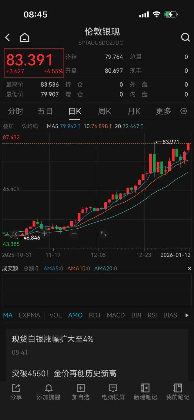 Group 1 - Precious metal prices surged significantly, with spot gold rising by 1.87% to surpass $4,593 per ounce, marking a historical high [1][3] - Spot silver increased by over 4.5%, reaching approximately $83 per ounce, nearing its historical peak [1][3] Group 2 - Domestic gold jewelry prices have also risen, with Chow Sang Sang's gold jewelry priced at ¥1,429 per gram, up by ¥19 from the previous day's ¥1,410 per gram [5] - Lao Miao's gold jewelry is now priced at ¥1,429 per gram, an increase of ¥22 from the previous day's ¥1,407 per gram [5]