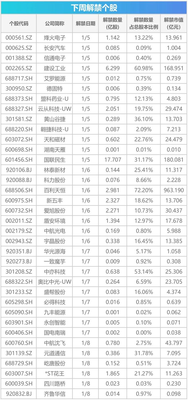 【重磅新闻】 CPI、PPI数据将公布 1月9日,国家统计局将公布2025年12月CPI、PPI数据。 参展的中国企业中,除了"老面孔"如联想、海信、TCL、京东方等,另一股新兴力量正加速涌入:中国 具身智能企业正以前所未有的规模集体登陆CES。 第一财经记者了解到,智元机器人、松延动力、北京人形机器人创新中心等多家具身智能企业将首次参 展CES。其中,智元预计将首次在美国完整展示其全系列产品线,并发布灵巧手等核心部件的新版本。 下周解禁市值超1600亿元 浙商证券预计12月CPI同比增速0.7%,环比持平;工业品价格方面,预计12月PPI同比增速为-1.9%,环 比持平。 成品油价将迎今年首次调整 根据"十个工作日"原则,2026年首轮调价窗口为1月6日24时。上一次调价窗口为12月22日24时,国内 汽、柴油价格每吨分别下调170元和165元。 2026年育儿补贴,下周一起全面开放申领 根据工作安排,2026年育儿补贴即将开放申领。2026年1月1日至4日将对育儿补贴信息管理系统进行升 级和测试,1月5日起全面开放申领。 据国家卫生健康委消息,截至目前,全国31个省(自治区、直辖市)均已发放育儿补贴,发放 ...