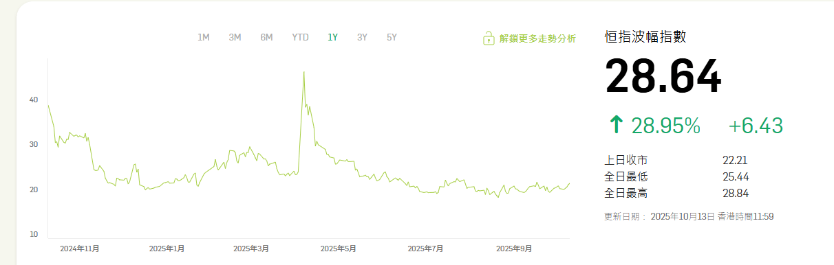 Group 1 - The Hang Seng Index experienced a significant decline, closing down 3.49% at 25,373.43 points during the early trading session on October 13 [1][2] - The Hang Seng Volatility Index, referred to as the "fear index" of Hong Kong, surged nearly 29%, reaching its highest level since May 2025, indicating heightened market anxiety [1][2] Group 2 - Among the constituent stocks of the Hang Seng Index, WuXi Biologics fell over 9%, while WuXi AppTec and Sunny Optical Technology dropped more than 8% [2] - Popular technology stocks also faced substantial declines, with Xiaomi Group-W and BYD Electronic falling over 7%, and JD Group-SW, Alibaba-W, and Baidu Group-SW decreasing more than 5% [2] - The Hang Seng Volatility Index is calculated based on the prices of current and next-period Hang Seng Index options, estimating potential volatility in the Hong Kong stock market over the next 30 days, reflecting market sentiment [2]
