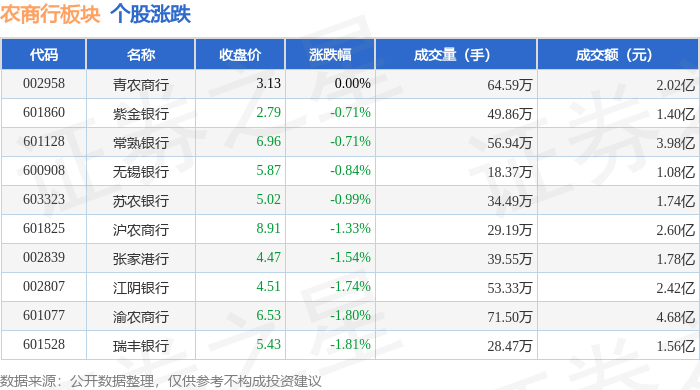 证券之星消息,1月14日农商行板块较上一交易日下跌1.28%,瑞丰银行领跌。当日上证指数报收于 4126.09,下跌0.31%。深证成指报收于14248.6,上涨0.56%。农商行板块个股涨跌见下表: | 代码 | 名称 | 收盘价 | 涨跌幅 | 成交量(手) | 成交额(元) | | --- | --- | --- | --- | --- | --- | | 002958 | 青农商行 | 3.13 | 0.00% | 64.59万 | 2.02亿 | | 601860 | 紫金银行 | 2.79 | -0.71% | 49.86万 | 1.40亿 | | 601128 | 常熟银行 | 6.96 | -0.71% | 56.94万 | 3.98亿 | | 600908 | 无锡银行 | 5.87 | -0.84% | - 18.37万 | 1.08亿 | | 603323 | 苏农银行 | 5.02 | -0.99% | 34.49万 | 1.74亿 | | 601825 | 沪农商行 | 8.91 | -1.33% | 29.19万 | 2.60亿 | | 002839 | 张家港行 | 4.47 | ...
