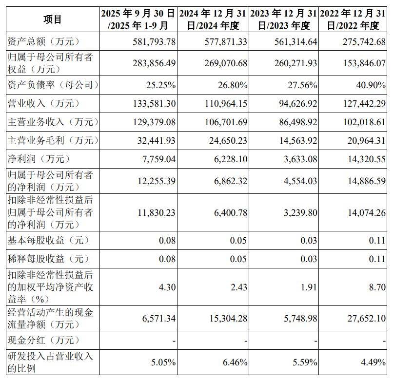 | 项目 | | 2025年9月30日 2024年12月31 2023年12月31 2022年12月31 | | | | --- | --- | --- | --- | --- | | | /2025 年 1-9 月 | 日/2024 年度 | 日/2023 年度 | 日/2022 年度 | | 资产总额(万元) | 581.793.78 | 577.871.33 | 561.314.64 | 275.742.68 | | 归属于母公司所有者 | 283.856.49 | 269,070.68 | 260.271.93 | 153.846.07 | | 权益(万元) | | | | | | 资产负债率(母公司) | 25.25% | 26.80% | 27.56% | 40.90% | | 营业收入(万元) | 133.581.30 | 110.964.15 | 94.626.92 | 127.442.29 | | 主营业务收入(万元) | 129.379.08 | 106.701.69 | 86.498.92 | 102.018.61 | | 主营业务毛利(万元) | 32.441.93 | 24.650. ...