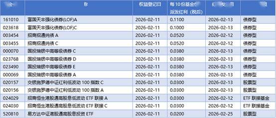 Trading Insights - As the Spring Festival approaches, the focus on "holding stocks or cash" resurfaces, with multiple public funds suggesting that holding stocks during the holiday has a higher success rate based on historical data, policy environment, and capital flow analysis [1] - Institutions indicate that market volatility during the long holiday is manageable, and a spring rally is anticipated post-holiday, recommending maintaining a moderate position to capture potential "red envelope market" opportunities [1] - On February 11, A-shares showed mixed performance, with the Shanghai Composite Index closing up by 3.62 points (0.09%) at 4131.99 points, while the Shenzhen Component Index fell by 49.69 points (0.35%) to 14160.93 points, and the ChiNext Index decreased by 35.80 points (1.08%) to 3284.74 points; trading volume in both markets dropped below 2 trillion yuan for the first time in 31 trading days, with over 3200 stocks declining [1] Fund News - On February 11, no new funds were launched, while 13 funds distributed dividends, primarily bond funds, with the highest dividend payout from the Fuguo Tianfeng Enhanced Income Bond Fund at 0.1100 yuan per 10 shares [2] - Since February, broad-based ETFs have experienced net outflows, although at a slowing pace, while thematic industry ETFs showed internal differentiation; cross-border ETFs have become a major attraction, with total scale reaching 1 trillion yuan, and ETFs linked to the Hang Seng Technology Index nearing 200 billion yuan, indicating sustained investor interest in the Hong Kong tech sector [2] - Ahead of the Spring Festival, market risk appetite has turned cautious, with public funds focusing more on safety margins and allocation space; long-term underweight stocks are seeing a recovery trend, driven by weak reduction motivation, significant expectation gaps, and the resonance of dividend strategies, becoming core targets for capital allocation [2]