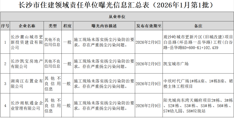 长沙晚报掌上长沙1月10日讯(全媒体记者 刘嘉)1月9日,长沙市住房和城乡建设局公开通报了一批住建行业从 业单位信息,对施工现场未落实扬尘污染防治要求、存在严重污染问题的4家企业予以曝光。被曝光的单位包括长 沙麓山城市更新投资建设有限公司、长沙凯宝房地产有限公司、湖南江右置业有限公司以及长沙雨航通金企业管 理有限公司。 此次曝光涉及的项目具体为:长沙麓山城市更新投资建设有限公司负责的观沙岭城市更新片区(旧城改建)项目 白岳路(环岳路—岳华路)工程;长沙凯宝房地产有限公司开发的凯宝城市广场项目;湖南江右置业有限公司建 设的中欣时代广场1#栋A座、1#栋B座、裙楼主体工程项目;以及长沙雨航通金企业管理有限公司所属的阳光城尚 东湾天樾府项目2#栋、3#栋、S2#栋、S3#栋、S5#栋、S6#栋、S7#幼儿园、S8#垃圾站。 下一步,市住建局将继续加强施工现场环保监管,推动全市建筑行业绿色、规范施工,助力城市环境质量持续改 善。 | | | | 从北单位 | | | | --- | --- | --- | --- | --- | --- | | 序号 | 企业名称 | 类型 程度 | 曝光内容描述 | 发布有效期至 ...
