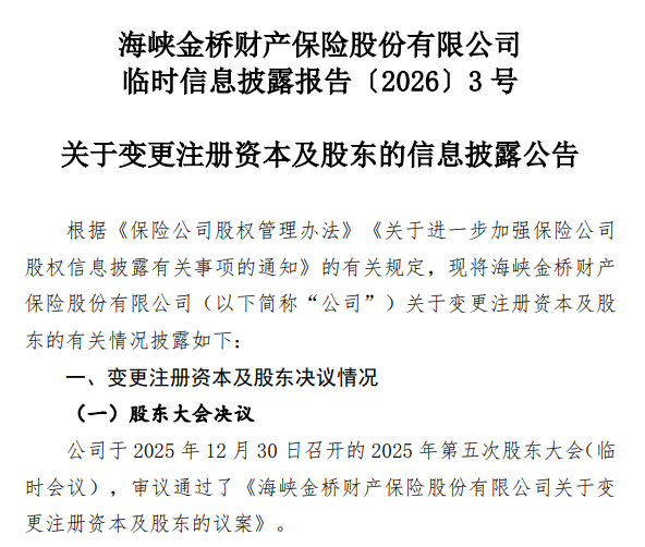 国资输血、将帅调整,这家财险公司迎来双重变革。 1月7日,海峡金桥财产保险股份有限公司(下称"海峡保险")发布关于变更注册资本及股东的信息披露公告称,公司拟增资10亿元, 发行股份32.26亿股,发行股份所得股款均计入公司注册资本,增资后注册资本变更为25亿元,待福建金融监管局批准后生效。 国资股东出手 根据公告,此次变更注册资本无新增股东。福建省投资开发集团有限责任公司(下称"福建投资集团")认购17.74亿股,总金额5.5亿 元;福建发展高速公路股份有限公司(下称"福建高速")认购5.81亿股,总金额1.8亿元;福州市投资管理有限公司(下称"福州投管")认 购5.48亿股,总金额1.7亿元;福建省船舶工业集团有限公司(下称"福船集团")认购3.23亿股,总金额1亿元。 与此同时,海峡保险股东厦门象屿集团有限公司拟将其所持有的全部公司股权(合计2.25亿股股份)以及由该股权而派生的所有权 益,转让给福建投资集团。每股转让价格为0.31元,转让股权总价为6975万元。 记者了解到,福建投资集团、福船集团实控人均为福建省国资委;福建高速、福州投管实控人分别为福建省交通运输厅、福州市财政 局。 变更完成后,福建投 ...