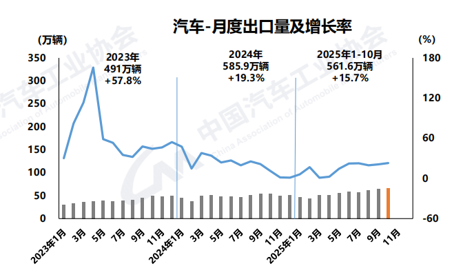 Core Insights - China's automobile exports reached 666,000 units in October, marking a month-on-month increase of 2.1% and a year-on-year increase of 22.9%, maintaining a level above 600,000 units for three consecutive months [1] - Cumulatively, from January to October, exports totaled 5.616 million units, reflecting a year-on-year growth of 15.7%, indicating a robust growth trend in China's automobile exports [1] Group 1: New Energy Vehicles (NEVs) - The export performance of new energy vehicles is particularly noteworthy, with 256,000 units exported in October, representing a month-on-month increase of 15.4% and a significant year-on-year increase of 99.9% [3] - From January to October, cumulative exports of new energy vehicles surpassed 2 million units for the first time, reaching 2.014 million units, which is a year-on-year increase of 90.4%, becoming a key driver of overall automobile export growth [3] Group 2: Traditional Fuel Vehicles - In contrast, exports of traditional fuel vehicles showed a decline, with cumulative exports from January to October totaling 3.601 million units, down 5.1% year-on-year, indicating a global shift towards new energy vehicles [4] - Overall, the scale of China's automobile exports continues to expand, with an ongoing optimization of the export structure, highlighting the increasing competitiveness and influence of China in the global automotive industry [4]