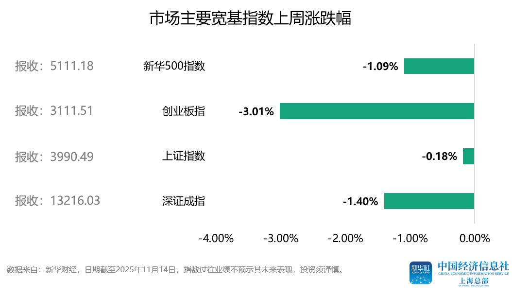 本周回顾 · 股票市场 本周(11月10日至11月14日)A股市场主要宽基指数悉数回调。其中,上证指数周度下跌0.18%;深证成指周度下跌1.40%;创业板指周度下跌3.01%;新华 500指数周度下跌1.09%。 新华500指数本周震荡回调,开盘报5180.21点,至14日收盘报5111.18点,全周振幅2.01%,成交额为3.43万亿元。 从申万一级行业来看,本周行业指数涨多跌少,综合、纺织服饰、商贸零售、美容护理、医药生物等行业指数涨幅居前,通信、电子、计算机、机械设备、 国防军工等行业指数跌幅居前。 外汇市场方面,美元指数本周整体走势承压,一度跌破99关口,周五收于99.28点,累计下跌0.26%,为连续第二周收跌。尽管美国联邦政府史上最长"停 摆"结束,但"停摆"导致美国部分关键经济数据发布缺失,令外界难以判断美国经济真实状况。非美货币多数上行,其中欧元兑美元累计上涨0.48%,日元兑 美元累计下挫0.72%,英镑兑美元累计上涨0.08%。加密货币市场本周全线下挫,比特币跌破95000美元。 | | 11月10日-11月14日当周数 | | | --- | --- | --- | | 分类 | 名称 ...