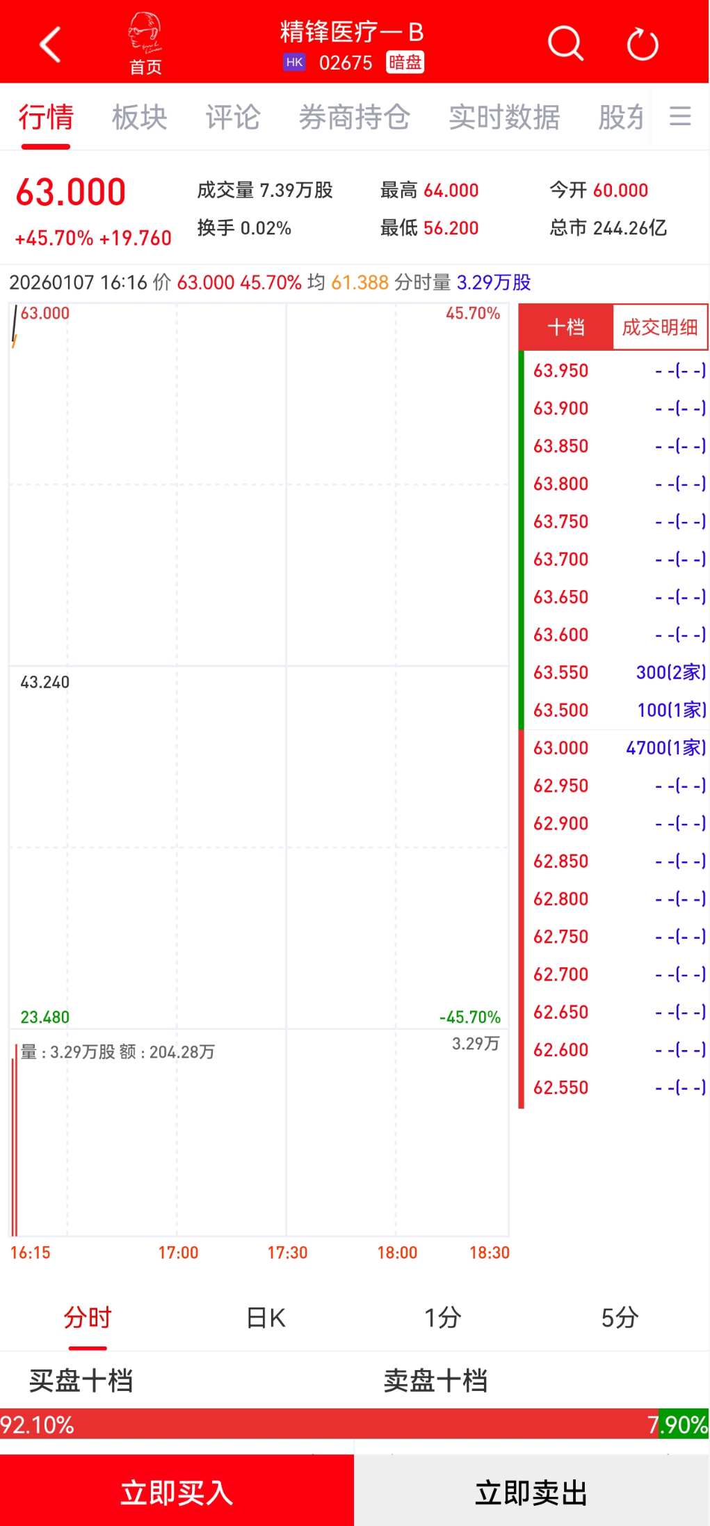 精锋医疗-B(02675)将于2026年1月8日(星期四)在香港挂牌。截至发稿,利弗莫尔证券暗盘交易显示报价63港元,较招股价43.24港元上涨45.7%, 每手100股,不计手续费,每手赚1976港元。 62.650 - -(- -) -45.70% 23.480 3.29万 - -(- -) 62.600 量:3.29万股 额:204.28万 - -(- -) 62.550 17:30 18:30 16:15 17:00 18:00 分时 1分 5分 日K 买盘十档 卖盘十档 92.10% 7.90% 立即卖出 立即买入 • 行情来源: 利弗莫尔证券 • ...