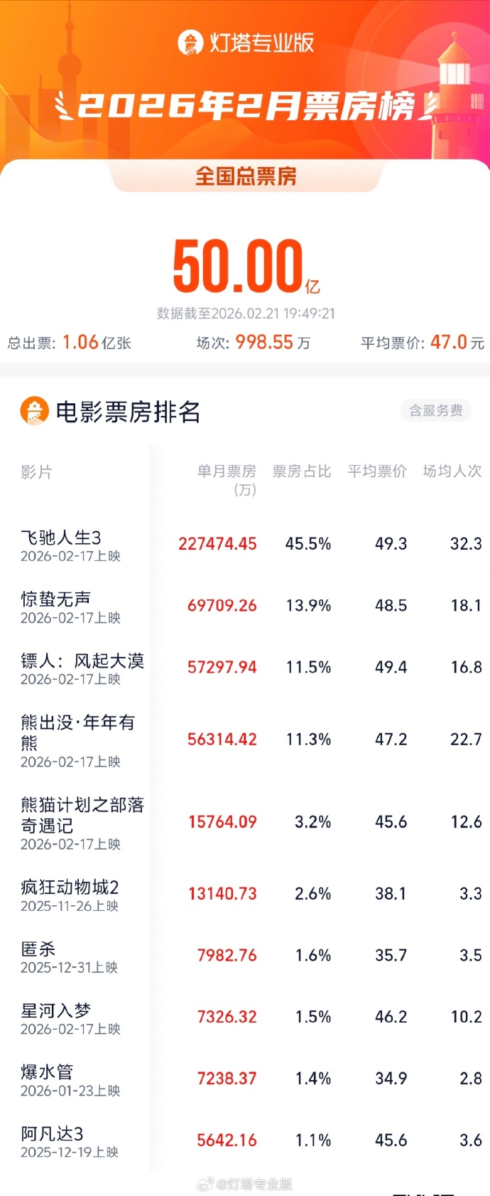 据灯塔专业版数据,截至2月21日,2026年2月全国总票房(含预售)破50亿元。 | 影片 | | 单月票房 票房占比 平均票价 场均人次 | | | | --- | --- | --- | --- | --- | | | (万) | | | | | 飞驰人生3 2026-02-17上映 | 227474.45 | 45.5% | 49.3 | 32.3 | | 惊蛰无声 2026-02-17上映 | 69709.26 | 13.9% | 48.5 | 18.1 | | 镖人:风起大漠 2026-02-17上映 | 57297.94 | 11.5% | 49.4 | 16.8 | | HAIX TTH | | | | | | --- | --- | --- | --- | --- | | 篇 | 56314.42 | 11.3% | 47.2 | 22.7 | | 2026-02-17上映 | | | | | | 熊猫计划之部落 | 15764.09 | 3.2% | 45.6 | 12.6 | | 奇遇记 | | | | | | 2026-02-17上映 | | | | | | 疯狂动物城2 | 13140 ...