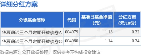 | 分级基金简称 | 代码 | 基准日基金净值 (元) | 分红方案 (元/10份) | | | --- | --- | --- | --- | --- | | 华夏鼎诺三个月定期开放债券A 004979 | | 1.13 | | 0.32 | | 华夏鼎诺三个月定期开放债券C 004980 | | 1.14 | | 0.34 | 本次分红对象为权益登记日在本公司登记在册的本基金全体基金份额持有人。,权益登记日为11月17 日,现金红利发放日为11月18日。选择红利再投资的投资者其现金红利转换为基金份额的基金份额净值 (NAV)确定日为2025年11月17日,该部分基金份额将于2025年11月18日直接计入其基金账户,投资者 可自2025年11月19日起查询。根据财政部、国家税务总局的财税[2002]128号《财政部、国家税务总局 关于开放式证券投资基金有关税收问题的通知》及财税[2008]1号《关于企业所得税若干优惠政策的通 知》的规定,基金向投资者分配的基金利润,暂不征收所得税。本基金本次分红免收分红手续费和红利 再投资费用。 证券之星消息,11月14日发布《华夏鼎诺三个月定期开放债券型发起式证券投资基金 ...