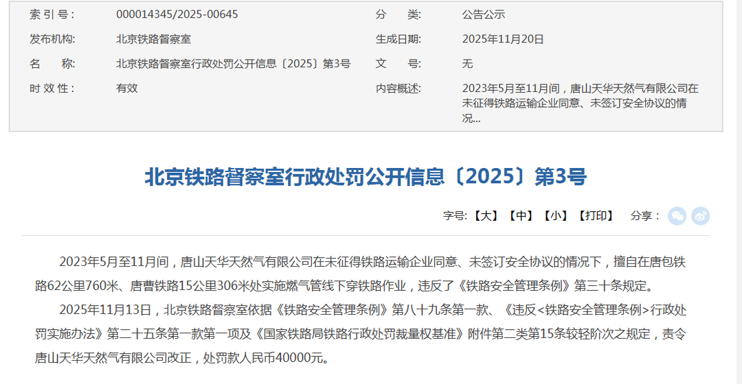 | 索引号: | 000014345/2025-00645 | 分 美 | 公告公示 | | --- | --- | --- | --- | | 发布机构: | 北京铁路督察室 | 生成目期: | 2025年11月20日 | | 名 称: | 北京铁路督察室行政处罚公开信息〔2025〕第3号 | 文 号: | 无 | | 时效性: | 有效 | 内容概述: | 2023年5月至11月间,唐山天华天然气有限公司在 | | | | | 未征得铁路运输企业同意、未签订安全协议的情 | | | | | 况 ... | 来自国家铁路局官网的消息: 2023年5月至11月间,唐山天华天然气有限公司在未征得铁路运输企业同意、未签订安全协议的情况下,擅自在唐包铁路62公里760米、唐曹铁路15公里 306米处实施燃气管线下穿铁路作业,违反了《铁路安全管理条例》第三十条规定。 2025年11月13日,北京铁路督察室依据《铁路安全管理条例》第八十九条第一款、《违反<铁路安全管理条例>行政处罚实施办法》第二十五条第一款第 一项及《国家铁路局铁路行政处罚裁量权基准》附件第二类第15条较轻阶次之规定,责令唐山天华天然气有限公司改正,处 ...