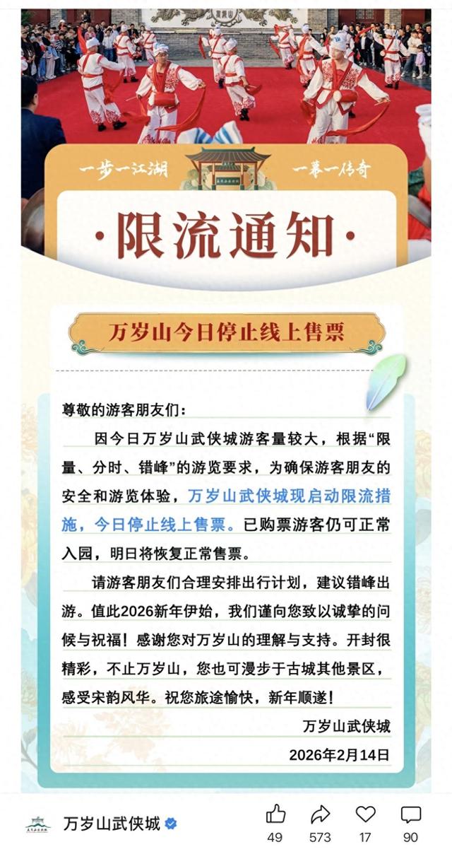 2月14日,春节假期前最后一个工作日,恰巧遇上"情人节",浪漫经济与年味经济叠加,带动文旅消费 热度激增。而随着"史上最长春节假期"即将到来,相关旅游产品的预订也在持续增长。 "抢跑"游客提前"占领"热门景区,多家景区已连日发布限流公告 同程旅行数据显示,2月14日出发的国内航空出行热度较上周同期增长超过40%,国内酒店市场在2月14 日迎来新一轮入住高峰,部分热门小城的酒店预订热度同比增长超1倍。 事实上,在拼假模式的带动下,部分旅客已提前开启假期生活,"抢跑"的游客提前"占领"热门景区,多 家景区已连日发布限流公告。 如当日14:10,万岁山武侠城发布通知称,因游客量较大,景区启动限流措施,当日停止线上售票。 智通财经(www.thepaper.cn)搜索发现,万岁山武侠城已经连续3天发布实行限流措施并停止售票的通 知。 无独有偶,老君山景区2月7日、2月11日、2月12日也都发布了限流公告称,预约售票数量达上限,建议 未成功预约购票的游客预约其他日期入园。 同程旅行的报告显示,春节假期前的最后一个工作日,选择将情人节与春节假期拼在一起凑成10天超长 假期正在成为热门趋势。在此背景下,2月14日也成为今年 ...