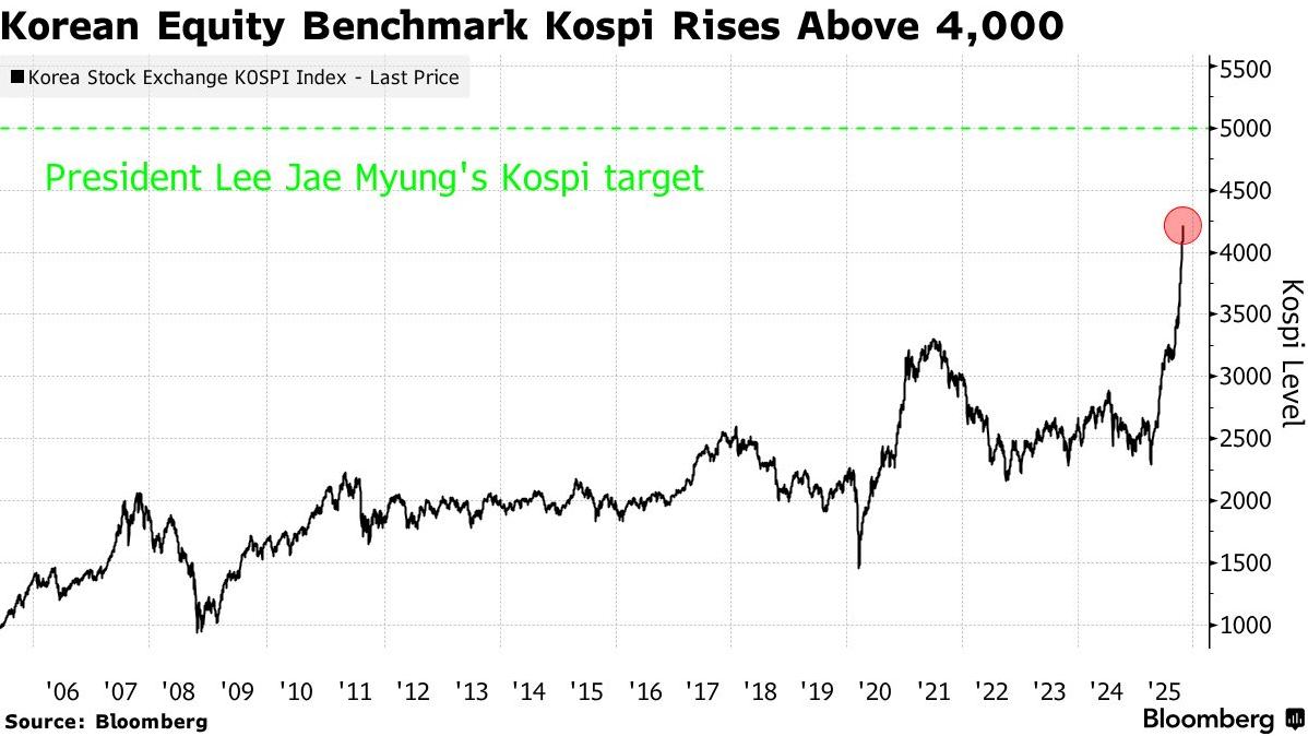 Group 1 - The KOSPI index is experiencing its strongest monthly performance in over 20 years, with a 20% increase in October, marking its best month since 2001, and has risen 76% year-to-date, leading global major indices [1] - The recent surge is attributed to growing confidence in South Korean tech giants like Samsung Electronics and SK Hynix in the AI innovation space, bolstered by a landmark agreement reached during Trump's visit to South Korea [4] - SK Hynix's stock surged 11% following record quarterly profits and a target price increase from 480,000 KRW to 1,000,000 KRW, reflecting a shift in valuation methods in light of new AI paradigms [4] Group 2 - Samsung Electronics also saw a 3.5% increase in stock price due to the same analyst's target price adjustment, alongside additional momentum from partnerships with Nvidia [4] - The positive sentiment has spread to supporting industries, with companies like HD Hyundai Electric and defense stocks rising due to agreements related to nuclear submarine construction [5] - Since early July, global investors have injected $12.8 billion into the South Korean stock market, indicating strong confidence in the market, partly due to supportive policies from the opposition leader Lee Jae-myung [6]