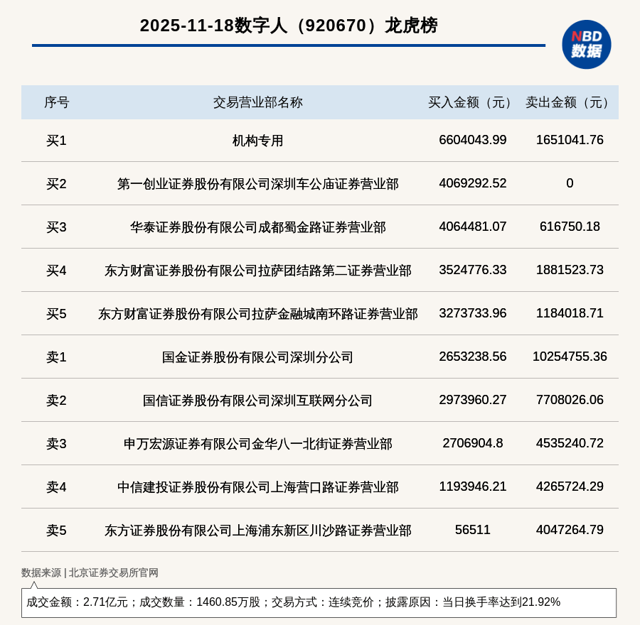 (记者 曾健辉) 免责声明:本文内容与数据仅供参考,不构成投资建议,使用前核实。据此操作,风险自担。 每日经济新闻 每经讯,2025年11月18日,北交所上市公司数字人(920670,收盘价:18.6元)登上龙虎榜,交易方式是连续竞价,披露原因是 当日换手率达到21.92%,成交数量1460.85万股,成交金额2.71亿元。买一席位为机构专用,买入660.4万元;卖一席位为国金证 券股份有限公司深圳分公司,卖出1025.48万元。 | | 2025-11-18数字人(920670) 龙虎榜 | | | | --- | --- | --- | --- | | 序号 | 交易营业部名称 | 买入金额(元) | 卖出金额(元) | | ਜੇਟ ਹ | 机构专用 | 6604043.99 | 1651041.76 | | 买2 | 第一创业证券股份有限公司深圳车公庙证券营业部 | 4069292.52 | 0 | | 买3 | 华泰证券股份有限公司成都蜀金路证券营业部 | 4064481.07 | 616750.18 | | द्र 4 | 东方财富证券股份有限公司拉萨团结路第二证券营业部 | 3524776.33 ...