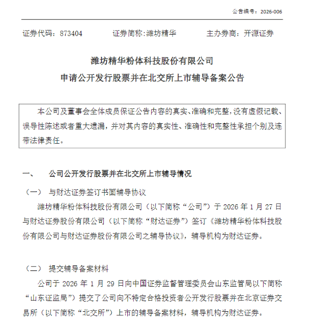 经济导报记者 杨佳琪 潍坊精华粉体科技股份有限公司(下称"潍坊精华")日前披露称,公司1月27日与财达证券签订《辅导协议》,并于1月29日向山东证监局 提交了向不特定合格投资者公开发行股票并在北交所上市的辅导备案材料,这意味着潍坊精华正式启动冲刺北交所上市。 公开资料显示,潍坊精华成立于2000年10月,位于潍坊市昌乐县,注册资本3118.5万元,法定代表人为吕勇,是国内最早也是最大的粉体 设备研发与制造民营企业之一,主要为锂电池材料、新材料、化工、环保、食品等多个行业提供定制化超细粉体制备设备。 据悉,在超细粉体制备设备领域,潍坊精华保持技术领先地位。随着新能源新材料产业的发展,公司电池负极材料专用制备设备受到市场 及下游客户广泛认可,并成为国内重要的电池负极材料制备设备制造企业。 自2008年以来,潍坊精华5次被认定(复审)为国家高新技术企业,是国家专精特新"小巨人"企业、国家重点支持"小巨人"企业、国家知识 产权优势企业、省专精特新中小企业等,曾获得山东省中小企业隐形冠军称号。 值得一提的是,潍坊精华于2025年10月刚刚挂牌新三板。此前,该公司董事长吕勇曾明确表示:"力争2027年在北交所上市"。 财 ...