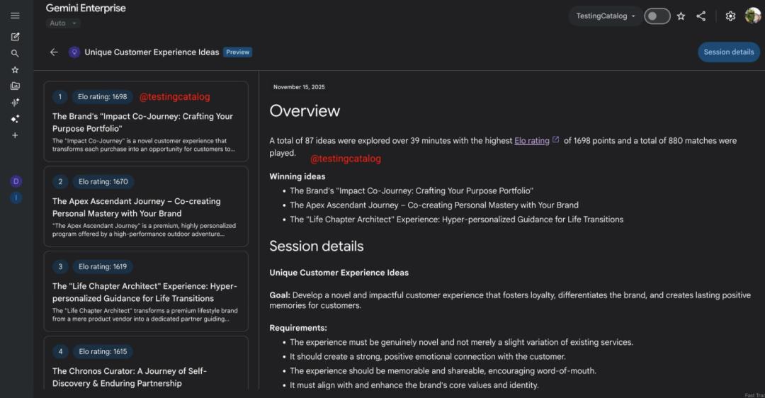 据悉,这种"先由点子生成器想方案,再由评审团进行竞赛式打分"的多智能体系统,在面向用户的产品中还是首次亮相。 果然,巴菲特的眼光绝对不会错——谷歌还是那个谷歌。 OpenAI定义的L3 AI,要被谷歌抢先一步了。 最新内测显示:Gemini可连续运行40分钟处理同一任务。。 在这段时间里,Gemini能根据用户输入,自动生成100+条创意,并由一组Agent对这些创意进行打分,排名,产出结构化的评审报告。 如此一来,用户不必再面对AI的草稿式输出,只需像筛选成熟方案一样,从智能体打磨后的结果中直接挑选即可,大幅减少了与单个Agent来回磨合的时 间。 换句话说,你只需负责决策拍板,探索和迭代的过程,全由Agent代劳。 谷歌的做法是把多智能体工作流、长时思考、对抗式生成三件事直接缝在一起。 本质上,这是在用"时间"换"质量"。 一句提示会在多智能体系统内部经历一个长达40多分钟的、完整的生成—竞争—筛选流程,而不是一次性吐出答案。 具体来看,Gemini for Enterprise的多智能体系统会首先接收主题与评估标准,大规模生成初始创意(100+)。 随后,多个Agent以竞赛方式对这些创意进行评分,排序 ...