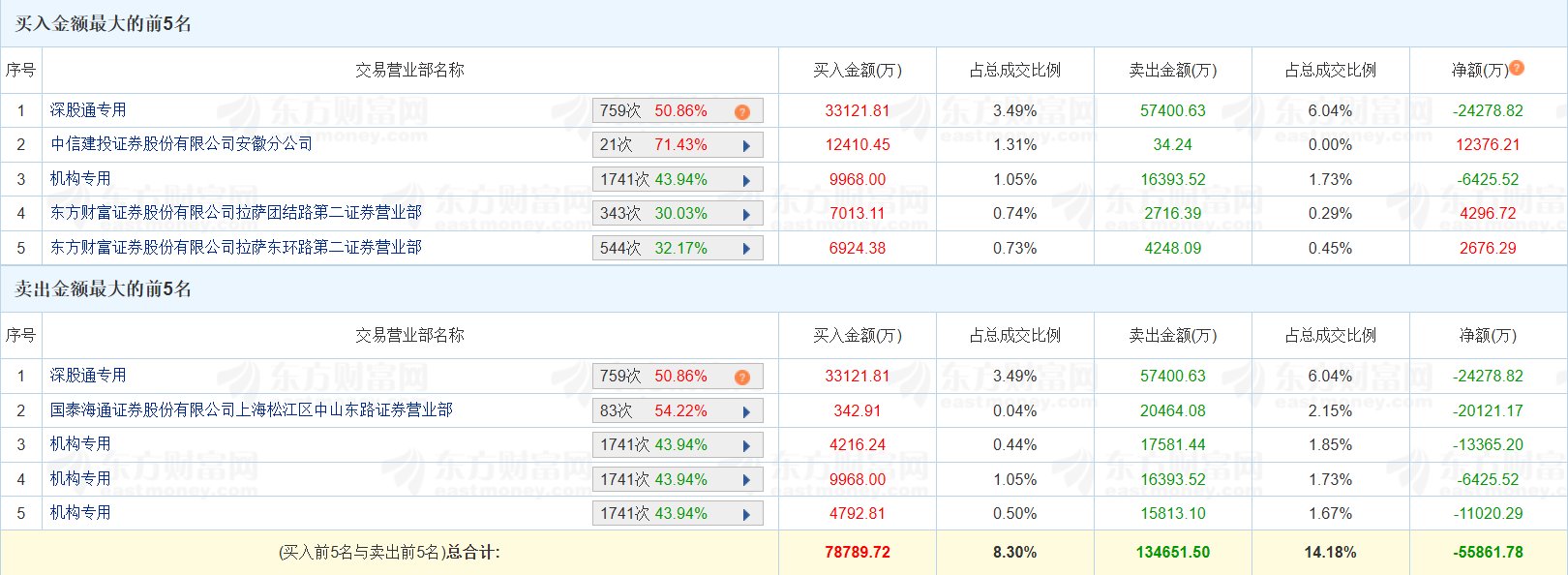 | 序号 | 交易营业部名称 | | | 买入金额(万) | 占总成交比例 | | --- | --- | --- | --- | --- | --- | | | 深股通专用 | 759次 50.86% | (7) | 33121.81 | 3.49% | | 2 | 中信建投证券股份有限公司安徽分公司 | 21次 71.43% | | 12410.45 | 1.31% | | 3 | 机构专用 | 1741次 43.94% | | 9968.00 | 1.05% | | 4 | 东方财富证券股份有限公司拉萨团结路第二证券营业部 | 343次 30.03% | | 7013.11 | 0.74% | | 5 | 东方财富证券股份有限公司拉萨东环路第二证券营业部 | 544次 32.17% | ▶ | 6924.38 | 0.73% | | 壶中全额量大的前5名 | | | | | | 润泽科技(300442.SZ)今日20CM涨停,换手率7.64%,成交额94.96亿元。龙虎榜数据显示,深股通买入3.31亿元,卖出5.74亿元,净卖出2.43亿元;三家机构 买入1.9亿元,卖出4.98亿元,净卖出3.08亿元 ...