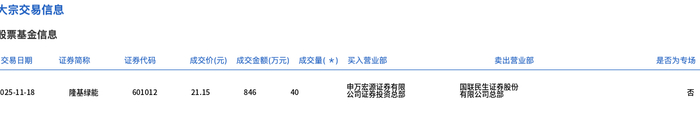 | 交易日期 | 证券简称 | 证券代码 ----- | 成交价(元) 成交金额(万元) 成交量(*) 买入营业部 | | 美出营业部 | 是否为专场 | | --- | --- | --- | --- | --- | --- | --- | | 025-11-18 | 隆基绿能 | 601012 | 21.15 846 846 40 | 患否查要话参复盟 | 霜聚焦焦烫酸酸 | ya | 11月18日,隆基绿能大宗交易成交40万股,成交额846万元,占当日总成交额的0.23%,成交价21.15 元,较市场收盘价21.15元持平。 ...