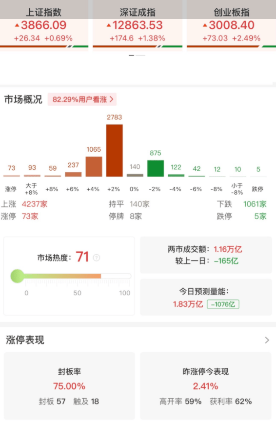 A股午评:三大指数集体上涨,沪指涨0.69%创业板指涨2.49%北证50涨0.42%,煤炭、算力硬件领涨!超4200股上涨,成交11709亿缩量181亿