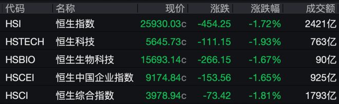 新能源车题材领跌,钢铁、有色金属、化工、煤炭跌幅居前,中国宏桥跌近6%。 个股方面,小鹏汽车跌逾10%,联想集团跌超4%,蔚来、快手跌超3%,腾讯音乐、理想汽车、小米集 团等跌超2%,百度健康、阿里健康等跌超1%,京东健康、阿里巴巴等小幅下跌;华虹半导体涨逾3%, 中芯国际、携程集团涨超1%。 编辑 | 钉钉 11月18日,香港恒生指数收跌1.72%,恒生科技指数跌1.93%。 | 代码 | 名称 | 现价 | 涨跌 | 涨跌幅 | 成交额 | | --- | --- | --- | --- | --- | --- | | HSI | 恒生指数 | 25930.03c | -454.25 | -1.72% | 2421亿 | | HSTECH | 恒生科技 | 5645.73c | -111.15 | -1.93% | 763亿 | | HSBIO | 恒生生物科技 | 15693.14c | -266.15 | -1.67% | 90亿 | | HSCEI | 恒生中国企业指数 | 9174.84c | -153.56 | -1.65% | 925亿 | | HSCI | 恒生综合指数 | 3978.94c ...