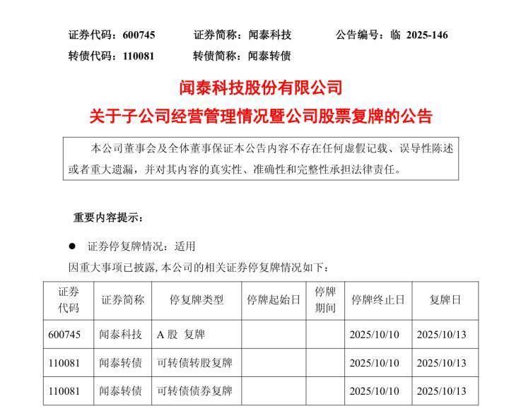 【大河财立方 记者 王宇】10月13日,闻泰科技(600745.SH)开盘跌停。该公司在12日公告,荷兰政府要求 旗下控股子公司安世半导体及其下属所有子公司、分公司、办事处等全球30个主体对其资产、知识产权、业 务及人员等不得进行任何调整,有效期为一年。 | 证券 代码 | 证券简称 | 停复牌类型 | 停牌起始日 | 停牌 期间 | 停牌终止日 | 复牌日 | | --- | --- | --- | --- | --- | --- | --- | | 600745 | 闻泰科技 | A 股 复牌 | | | 2025/10/10 | 2025/10/13 | | 110081 | 闻泰转债 | 可转债转股复牌 | | | 2025/10/10 | 2025/10/13 | | 110081 | 闻泰转债 | 可转债债券复牌 | | | 2025/10/10 | 2025/10/13 | 该公告一出,随即引发半导体行业关注。"该事件凸显中资企业收购欧洲半导体资产的系统性歧视,荷兰 以'黄金股'机制和国家安全审查扩大化,实质背离欧盟《外资审查框架条例》的'非歧视'原则。"上海市海华 永泰律师事务所高级合伙人孙宇 ...