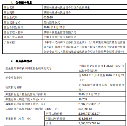 募集期间净认购金额2,507,727,332.07元,认购资金在募集期间产生的利息538,396.67元,募集份额 合计2,508,265,728.74份。 基金经理农冰立曾任泰达宏利基金研究部研究员,天风证券研究所电子行业首席分析师,工银瑞信 基金研究部分析师、基金经理。2022年10月加入景顺长城基金管理有限公司,2023年7月起担任股票投 资部基金经理。 | 1. 公司 24个日本 | | | --- | --- | | 基金名称 | 景顺长城成长优选混合型证券投资基金 | | 基金间称 | 景顺长城成长优选混合 | | 基金主代码 | 025925 | | 基金运作方式 | 契约型开放式 | | 基金合同生效日 | 2026年1月23日 | | 基金管理人名称 | 景顺长城基金管理有限公司 | | 基金托管人名称 | 中国工商银行股份有限公司 | | 公告依据 | 《中华人民共和国证券投资基金法》、《公开募集证券投资基金运作管 | | | 理办法》等相关法律法规以及《资顺长城成长优选混合型证券投资基 | | | 金基金合同》、《景顺长城成长优选混合型证券投资基金招募说明书》 | 中国经济网北京1月26 ...