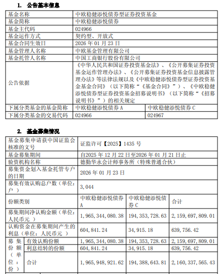 | 4 基重要是用比 | | --- | | side He .. Le bale clife ... Le liver a | | 基金募集申请获中国证监会 | 证监许可【2025】1435号 | | | | --- | --- | --- | --- | | 核准的文号 | | | | | 基金募集期间 | 自2025年12月22日至2026年01月21日止 | | | | 验资机构名称 | 德勒华永会计师事务所(特殊普通合伙) | | | | 募集资金划入基金托管专户 | 2026年01月23日 | | | | 的日期 | | | | | 募集有效认购息户数(单位: 户) | 3.044 | | | | 份额类别 | 中欧稳健添悅债券 中欧稳健添悦债 | | 合计 | | | A 券C | | | | 募集期间净认购金额(单位: | 1.965. 344. 080. 38 194. 353. 728. 63 | | 2. 159. 697. 809. 01 | | 人民币元 ) | | | | | 认购资金在基集期间产生的 | 604, 841. 24 | 34. 915. 18 | 639. 756. ...