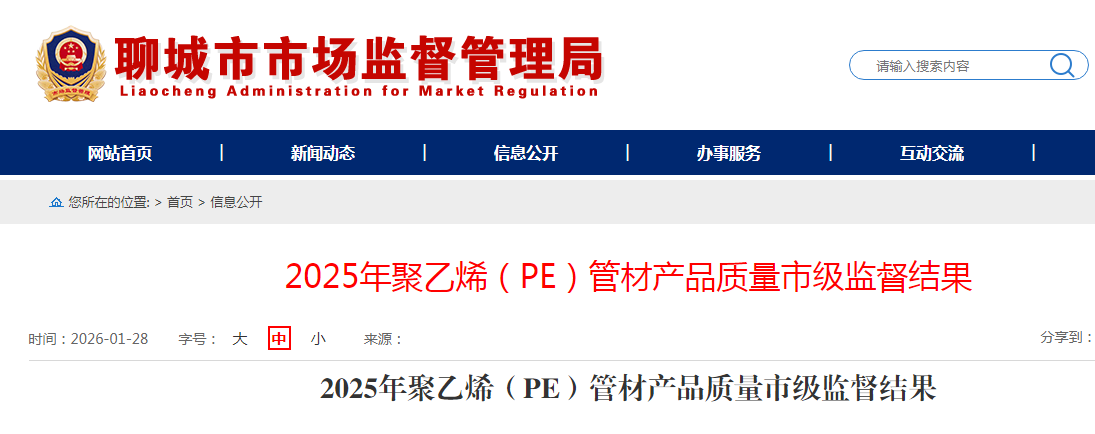 山东省聊城市市场监督管理局公布2025年聚乙烯(PE)管材产品质量市级监督结果