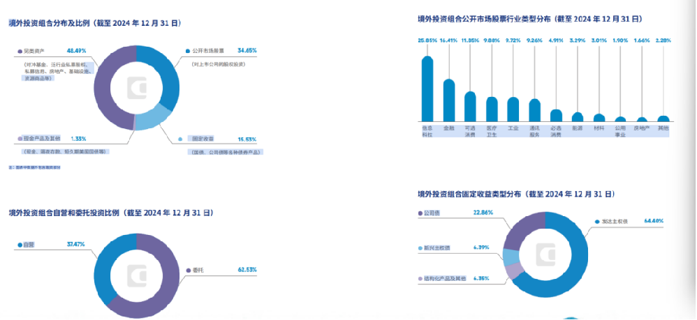 尽管近年来对外投资环境发生较大改变,但作为国家主权财富基金的中投公司年化收益一直保持稳定态势。 中投公司披露的最新报告显示,截至2024年12月31日,中投公司过去十年对外投资年化净收益率按美元计算为6.92%,超出业绩目标61个基 点。自成立以来累计年化净收益率按美元计算为6.39%。 从资产类型来看,中投公司在全球范围内布局的资产类别包括另类资产、公开市场股票、固定收益以及现金产品。 中投公司是长期机构投资者,投资考核周期为10年,滚动年化回报率为评估投资绩效的重要指标。截至2020年末~2024年末,中投公司十年 对外投资年化净收益率按美元计算分别为6.82%、8.73%、6.43%、6.57%、6.92%,分别超出十年业绩目标约128个基点、约296个基点、26个 基点、31个基点、61个基点。 持续保持超预期回报背后,中投公司对全球资产的布局备受关注。 其他行业中,可选消费(弹性消费)2020年在中投公司的股票投资比重为13.72%,跃升至第二大行业,但2021年又被金融超越;2020年以 来,中投公司对医疗卫生(医疗健康)领域的投资比重一直维持在11%以上,最高时在2022年末一度超过14%,去年 ...