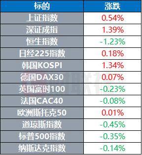 WTI原油期货价格收跌2%,报58.88美元/桶;布伦特原油期货收跌1.98%,报62.49美元/桶。 美东时间周一,美股三大指数集体收跌,道指跌0.45%,纳指跌0.14%,标普500指数跌0.35%。 纳斯达克中国金龙指数收涨0.08%,热门中概股涨跌不一,高途、世纪互联涨超4%,百度、名创优品涨 超3%,小鹏汽车、新东方涨超2%,网易跌超2%,爱奇艺跌近1%。 COMEX黄金期货收跌0.54%,报4219.9美元/盎司;COMEX白银期货收跌0.94%,报58.5美元/盎司。 隔夜股市 | 标的 | 涨跌 | | --- | --- | | 上证指数 | 0.54% | | 深证成指 | 1.39% | | 恒生指数 | -1.23% | | 日经225指数 | 0.18% | | 韩国KOSPI | 1.34% | | 德国DAX30 | 0.07% | | 英国富时100 | -0.23% | | 法国CAC40 | -0.08% | | 欧洲斯托克50 | 0.01% | | 道琼斯指数 | -0.45% | | 标普500指数 | -0.35% | | 纳斯达克指数 | -0.14% | 欧股主 ...
